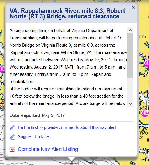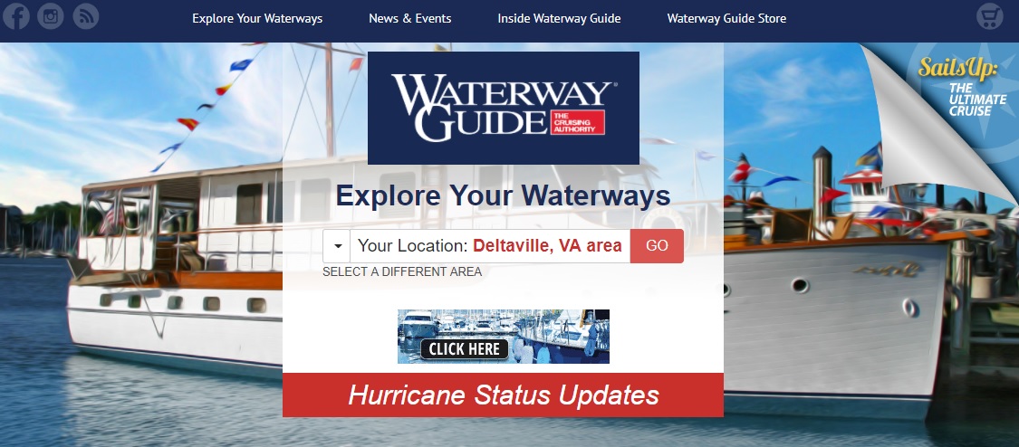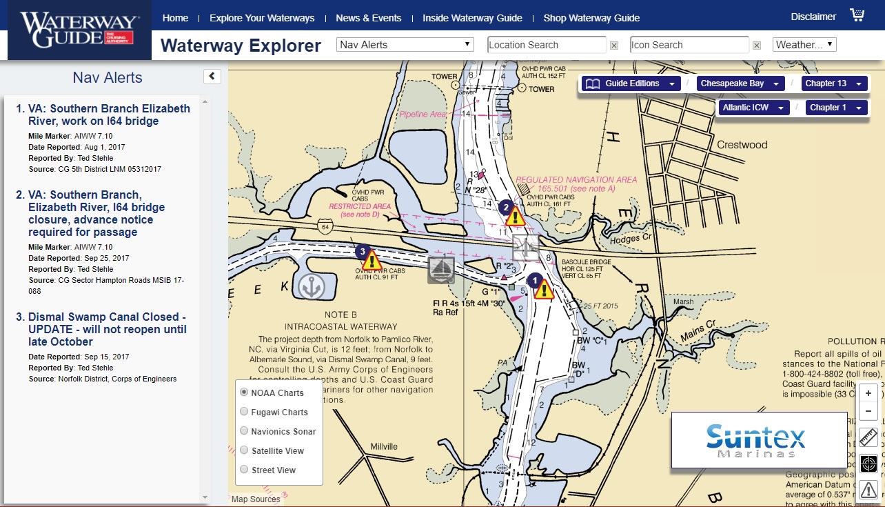 Navigation alerts and updates can be viewed using the Waterway Explorer tool on Waterway Guide's website.